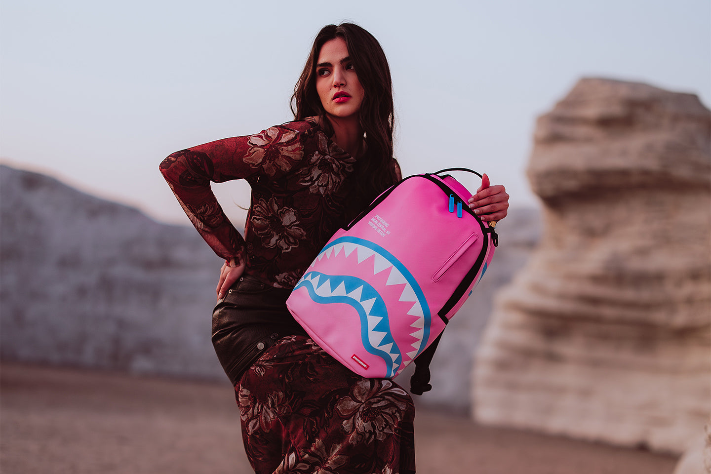 Dimensions: 18" x 6" x 11.5" ? Front zipper pocket ? Side pockets ? Zippered Stash pocket ? Separate velour sunglass compartment ? Ergonomic mesh back padding ? Adjustable Straps for custom sizing ? Gold zippers with metal hardware ? Metal "Sprayground Authentic" badge ? Slide through back sleeve connects to carry-on luggage to free your hands